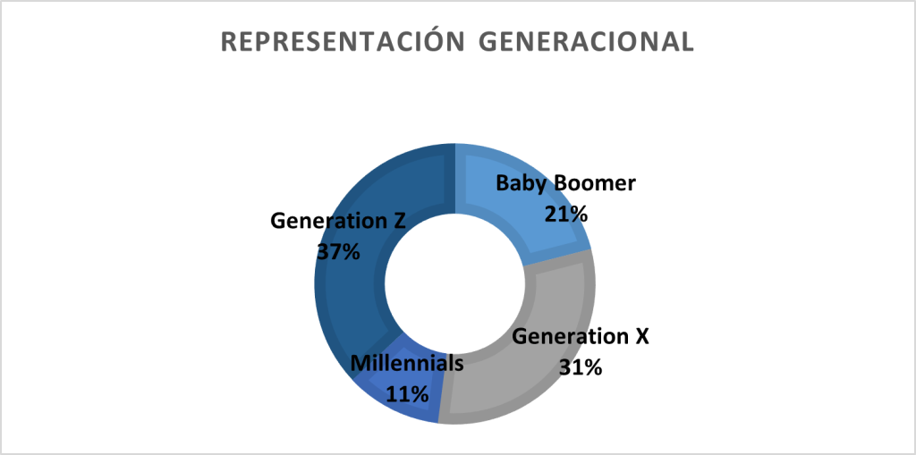 Los grupos de edad que se pueden encontrar en las empresas pueden ser: Generación Z (nacidos después de 1997), Millennials (nacidos en 1981-1996), Generación X (nacidos en 1965-1980) y Baby Boomers (nacidos en 1946-1964).